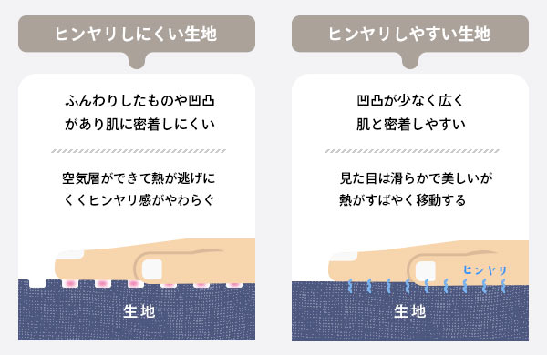 反対に、平らで凹凸が少なく、肌と広く密着しやすい生地は、熱がすばやく移動するためヒンヤリしやすくなります。