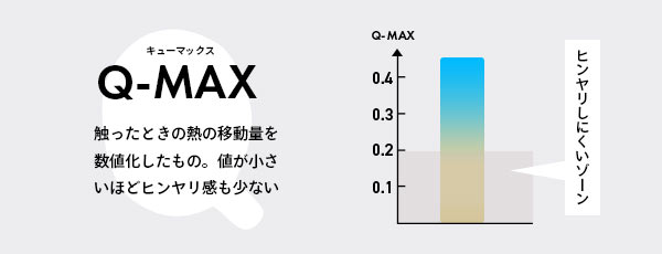Q-MAXとは、肌が素材に触れた瞬間に”どれだけ熱が移動するか”を表したものです。値が大きいほどヒンヤリしやすく、逆に小さいほどヒンヤリしにくくなります。