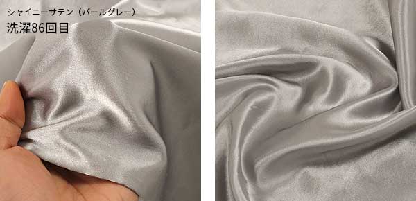 対して、シャイニーサテン。『洗濯86回(パールグレー)』ですが、これでもある程度劣化した状態ですが未だこの光沢感!ポリエステル繊維は繊維が強く毛羽立ちにくいので、サテンの光沢感や滑らかさを長く楽しめます。