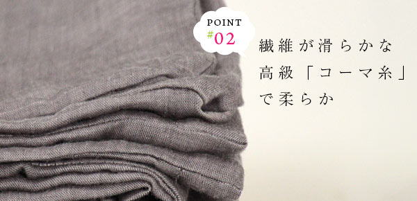 繊維が滑らかな高級『コーマ糸』で柔らか!更に、本品の糸は『コーマ糸(こーまし)』というとても上質な糸を使用することで、柔らかさをアップさせています。 コーマ糸とは、糸を均一にするために短い糸を除去する『コーマ工程(コーミング)』を行った糸のことです。 毛羽立ちの原因が取り除かれ、繊維にムラが無くなり、滑らかで柔らな風合いになります。 他にも、『強度や光沢感』などが増します。